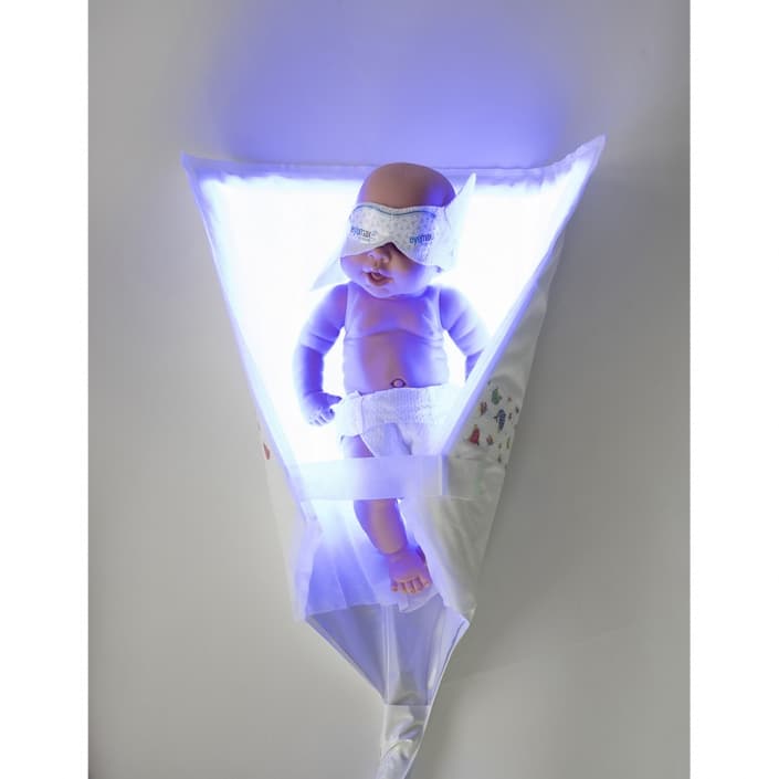 The BiliCocoon® Nest system is more adapted for preterm babies. It consists of a large pad allowing wrapping and is adapted for kangaroo care and incubator. The Nest system allows easy access to the newborn.