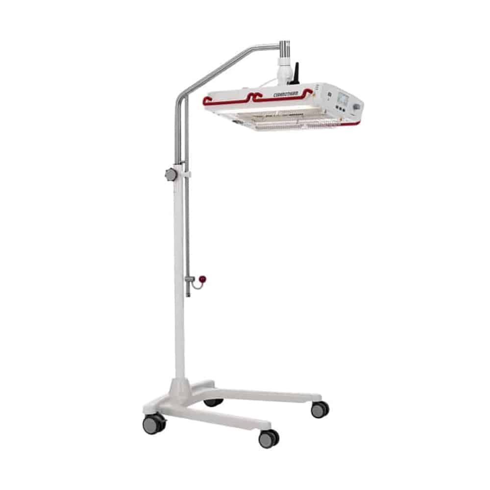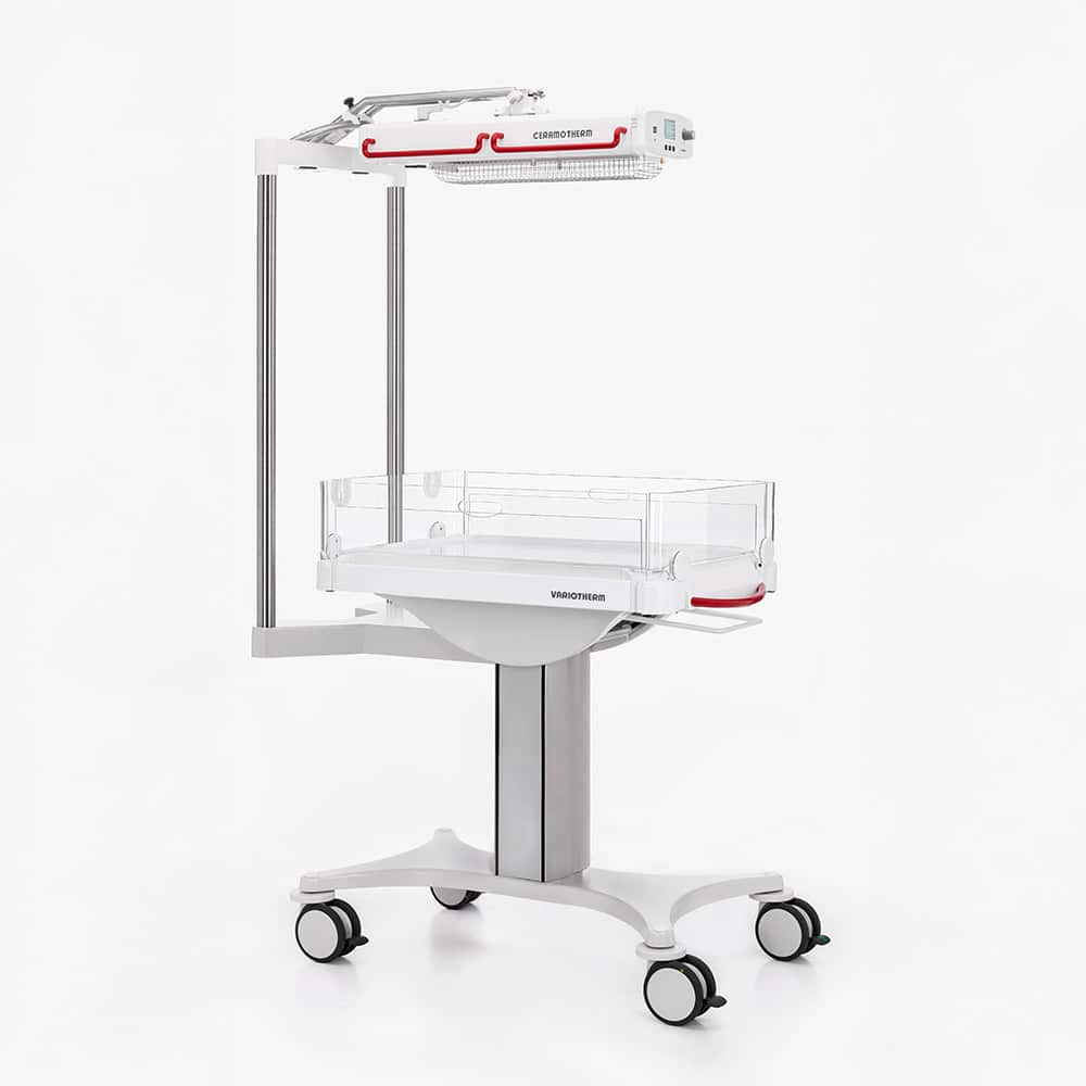 The Weyer Ceramotherm® 3000 for mobile use is a versatile radiant warmer designed to provide efficient thermal support for newborns during procedures such as baby changing and examinations. Mounted on a height-adjustable stand with four antistatic castors, it offers 360° rotation and ±45° vertical tilt, ensuring precise heat application while featuring integrated patient temperature measurement, skin temperature control, intensity adjustment, and safety timers.