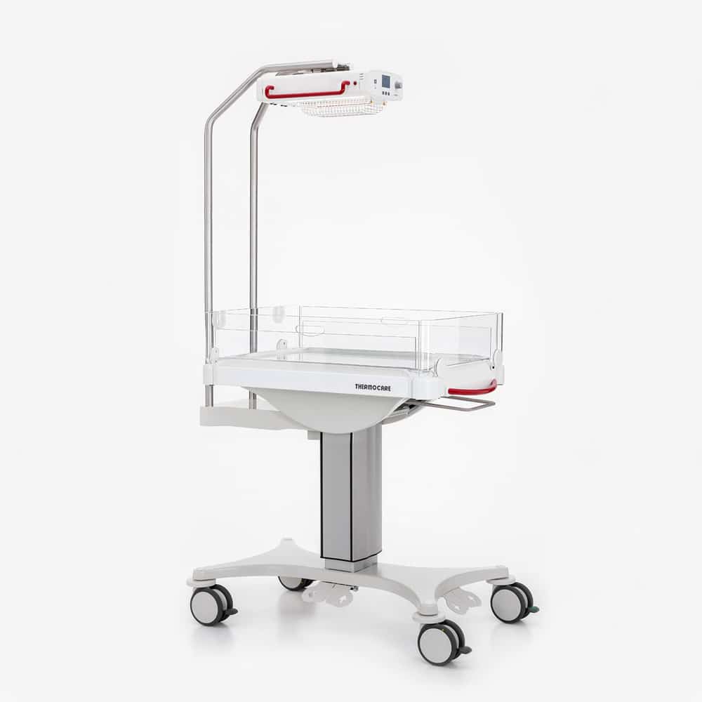 The Weyer Thermocare KCE is a neonatal warming bed designed to provide a thermally stable environment for infants requiring intermediate care. It features both under-pad heating and an overhead radiant warmer, and is fully height-adjustable to support infant development and facilitate caregiver access.