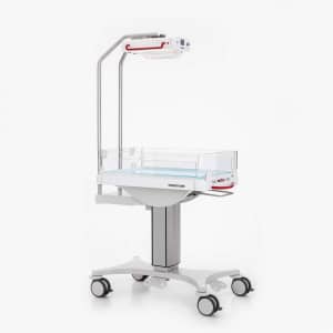 The Weyer Thermocare KCE is a neonatal warming bed designed to provide a thermally stable environment for infants requiring intermediate care. It features both under-pad heating and an overhead radiant warmer, and is fully height-adjustable to support infant development and facilitate caregiver access.