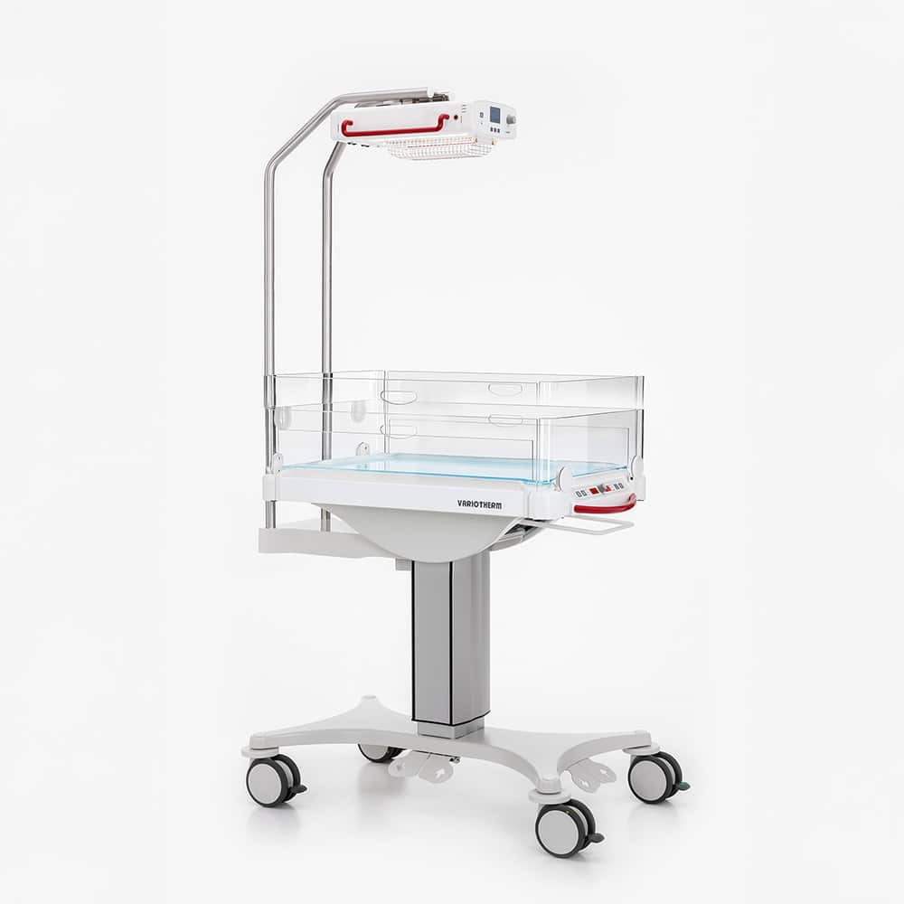 The Weyer Variotherm KCE is a neonatal care unit designed to provide warmth and comfort to newborn and premature infants during their early days. It features a modular structure that can be upgraded for various uses, such as examination, resuscitation, or intensive care, with different lens systems and accessory modules.